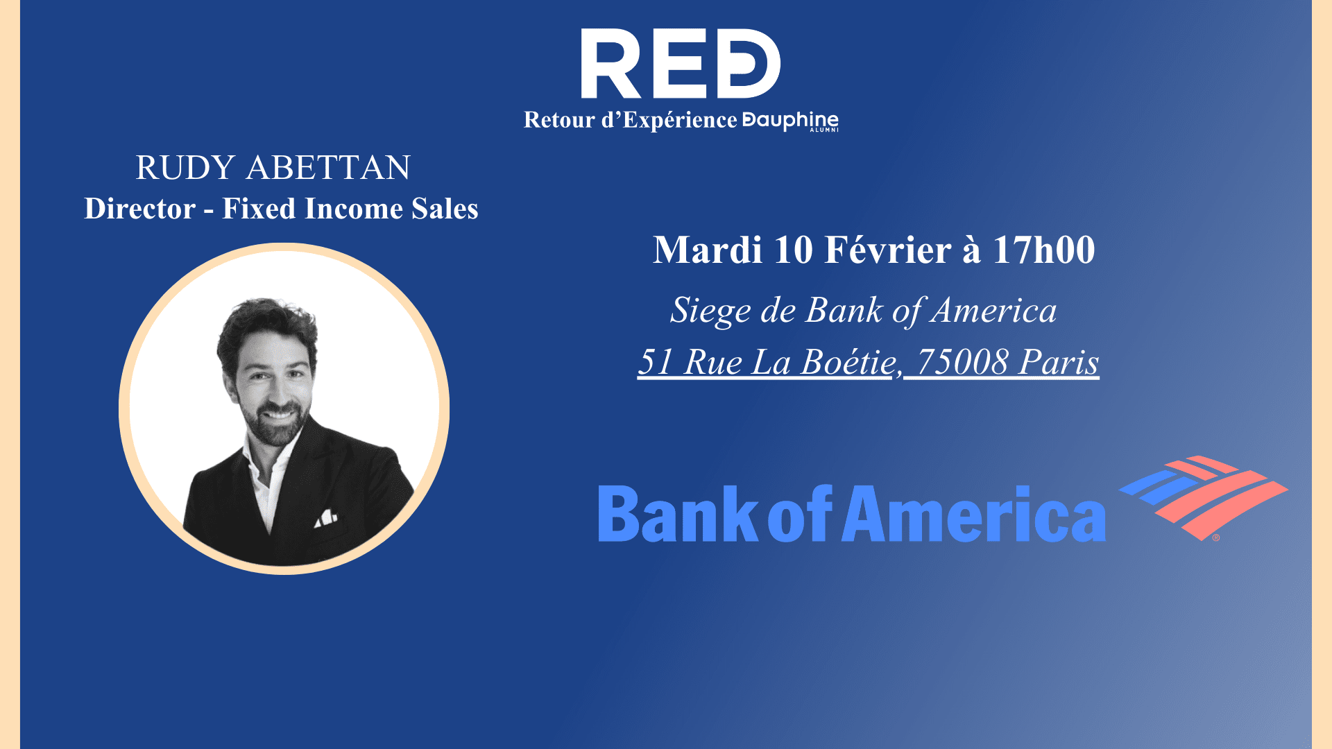Nous avons le plaisir de vous inviter à un nouvel évènement RED – Retour d’Expérience avec Rudy Abettan, Director- Fixed Income Sales chez Bank of America.